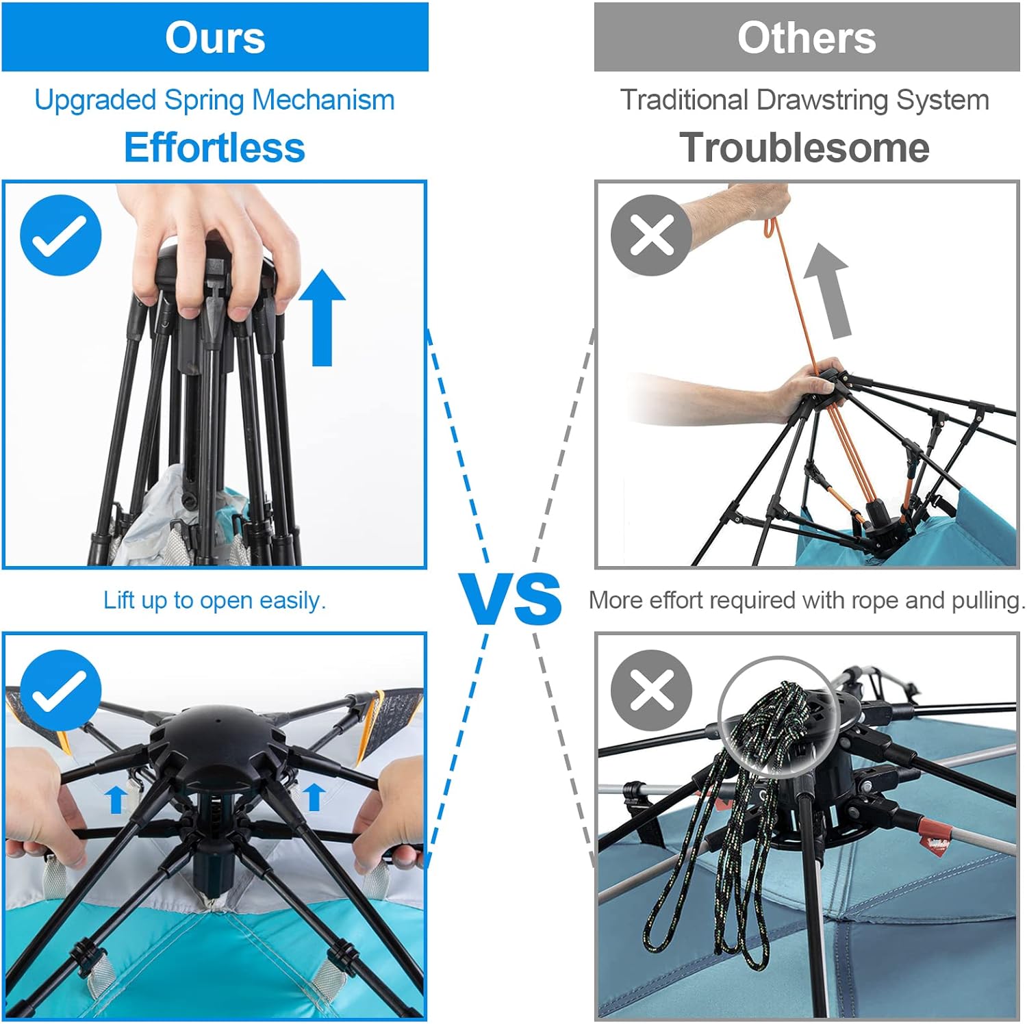 - Easy Setup & Super Stable: The specially designed spring opening system shows an industry-leading level of improvement. One person can set up the beach canopy easily in seconds. Compared to the drawstring design, this one is faster, effortless, and saves more time.